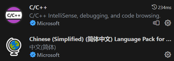 配置 VS Code。VS Code 窗口左侧,有一个叫 Extension 的窗格,可以在其中搜索 zh-cn 与 c 这两个关键字,分别配置简体中文与 C/C++。就像这样两个: